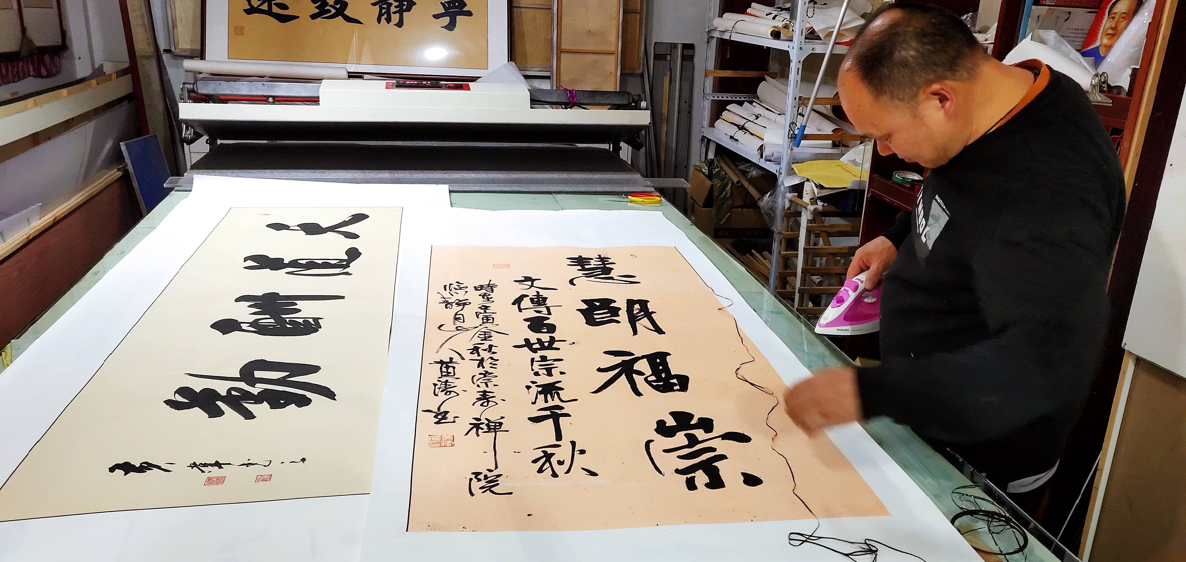 黄富顺:古人对国画和书法的装裱和修复是很慎重的,崇奉的行业神为文昌帝君。俗话说,三分画,七分裱,书画只有经过装裱,才能登堂入室,更好地保存以及观赏,或得以流传于人间。装裱是一门高雅复杂精致的技艺,一幅作品的装裱需要揭、洗、托、裁、镶、覆、装等几十道工序,是极具我国民族传统特色的艺术之一,不仅要掌握书法、美术等方面知识,还需要在文房材料、裁剪比例、时间控制、艺术品收藏等方面有一定的研究和实践。除此之外,还需要有甘为书画作嫁衣的平和心态、需要对修复和装饰工作有足够的耐心、爱心及敬畏之心。